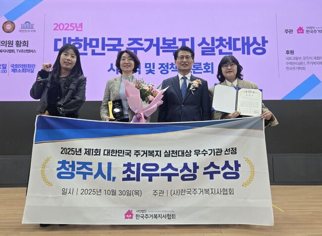 청주시는 30일 국회의원회관에서 열린 ‘2025년 대한민국주거복지실천대상’ 시상식에서 전국 자치단체 중 유일하게 기관(단체) 부문 ‘최우수상’을 수상했다.