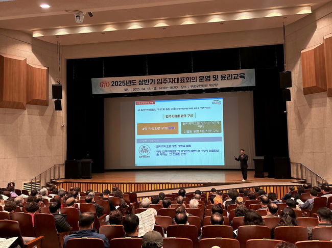 지난 4월 18일 구로구민회관 대강당, 2025년 상반기 입주자대표회의 운영 및 윤리교육이 진행되고 있다.구로구(구청장 장인홍)는 오는 4일 오후 2시부터 6시까지 구로구민회관 대강당에서 ‘입주자대표회의 운영 및 윤리 교육’을 개최한다고 밝혔다.