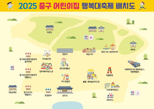 2025 중구 어린이집 행복대축제 배치도.서울 중구(구청장 김길성)는 오는 11월 8일 토요일 오전 9시 30분부터 12시 30분까지 남산골 한옥마을 천우각 광장 일대에서 ‘2025 중구어린이집 행복대축제’를 개최한다고 밝혔다.