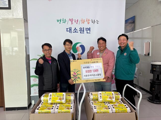 대소원면행정복지센터(면장 지상진)는 서충주 라이온스 클럽(회장 김병석)이 센터를 방문해 지역 취약계층을 위한 유정란(15구) 124판을 기부했다고 밝혔다.