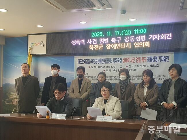 사단법인 충북지체장애인협회 옥천군지부 등 9개 단체는 이날 오전 옥천군청 브리핑룸에서 공동성명을 내고 “중증발달장애인을 대상으로 심각한 범죄가 발생했는데도 장애인 권익옹호에 앞장서야 할 시설은 사실을 은폐한 정황이 드러났다”고 주장했다.