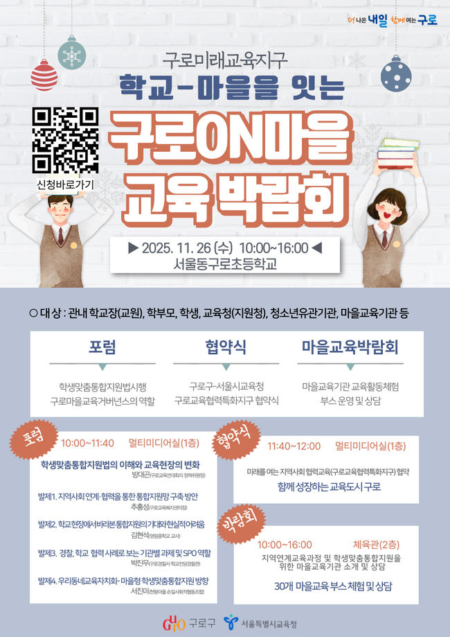참석자들은 학생 통합지원을 위한 과제와 실천 방안을 함께 논의한다. 이후 장인홍 구로구청장과 정근식 서울시교육감은 ‘함께 성장하는 교육도시 구로’ 실현을 위한 지역사회협력교육(구로교육협력특화지구) 협약을 체결할 예정이다.