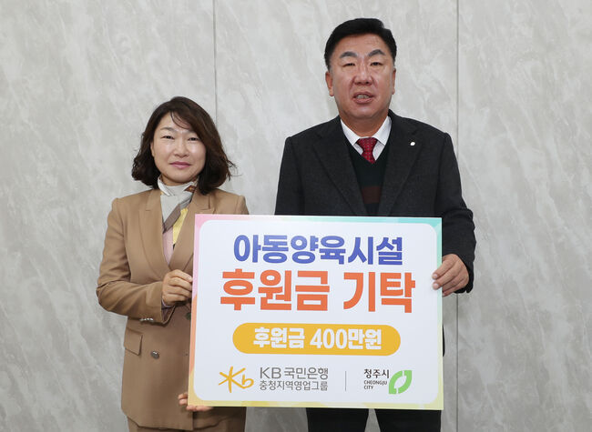 KB국민은행 충청그룹, 청주시 아동복지시설에 400만원 후원KB국민은행 충청지역영업그룹(대표 장문자)은 21일 청주 지역 아동복지시설을 지원하기 위해 후원금 400만원을 청주시에 기탁했다.임시청사 직지실에서 개최된 기탁식에는 이범석 청주시장과 국민은행 장문자 충청지역영업그룹 대표, 김근태 청주지역본부장, 안병환 청주종합금융센터 지점장이 참석했다.