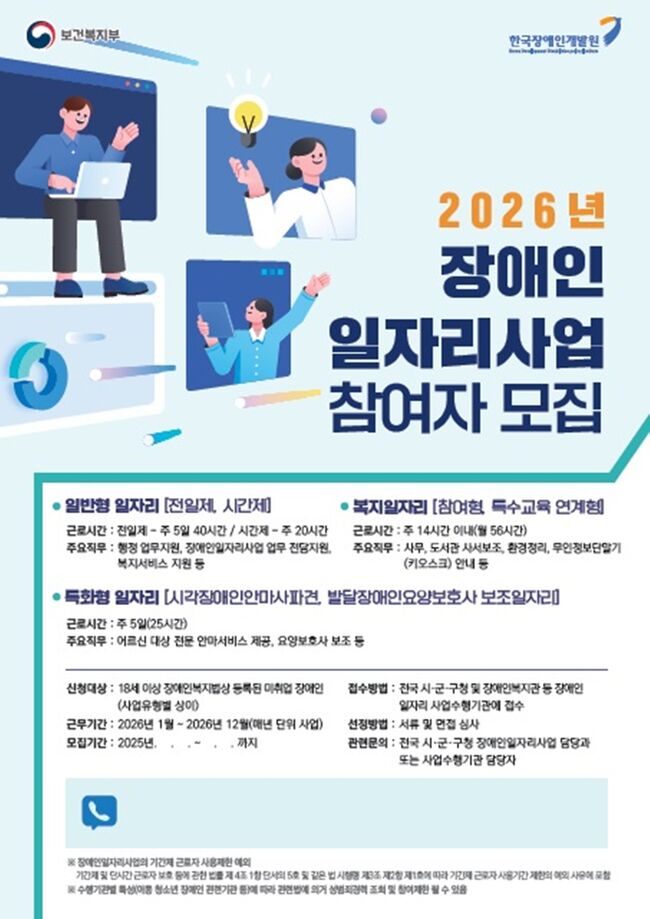 한편, △장애인복지일자리 △발달장애인요양보호사 보조일자리 △시각장애인안마사파견 일자리 등은 수행기관인 충청북도장애인종합복지관과 (사)대한안마사협회 충북지부에서 별도로 모집하며, 모집 일정과 신청 방법은 각 수행기관 누리집을 통해 확인할 수 있다.