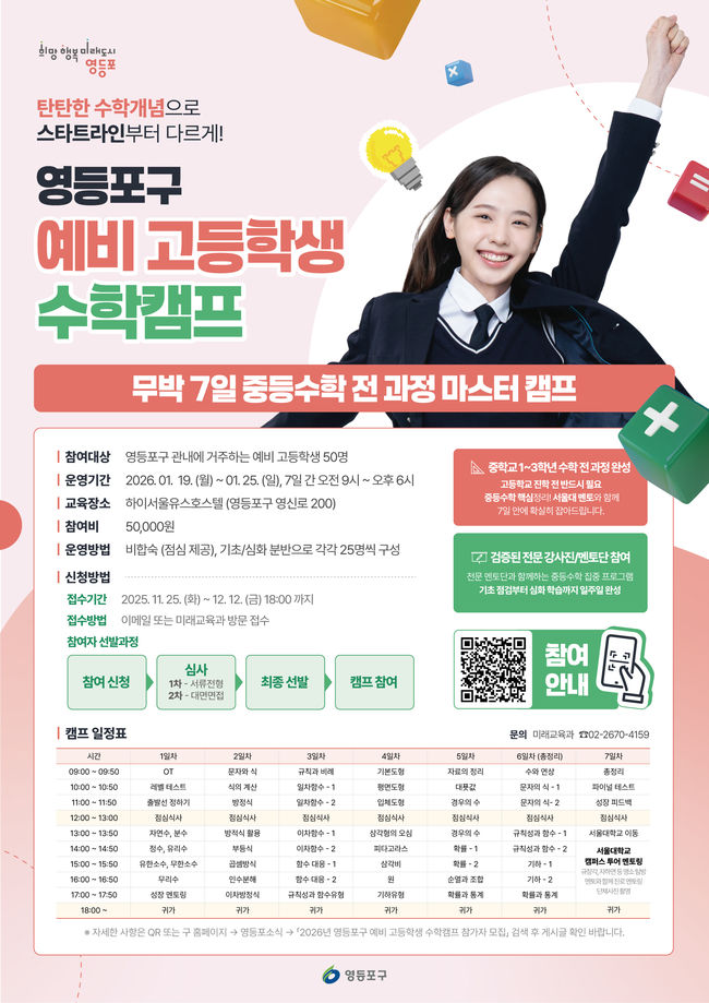 최호권 영등포구청장은 “이번 캠프는 고등학교 진학을 앞둔 학생들이 수학 기초를 단기간에 강화할 수 있는 좋은 기회”라며 “학생들이 자신감을 갖고 스스로 학습해 나갈 힘을 기를 수 있도록 지원을 이어가겠다”고 말했다.