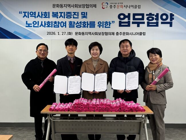 충주문화시니어클럽(관장 박보경)과 문화동 지역사회보장협의체(위원장 장민호)가 27일 지역사회 복지 증진과 노인 사회참여 활성화를 위한 업무협약을 체결했다고 밝혔다.이번 협약을 통해 양 기관은 △노인일자리 및 사회활동지원사업과 지역사회 복지자원 연계 △지역사회 복지증진을 위한 공동 프로그램 기획·운영 △복지 사각지대 해소를 위한 정보 공유 및 협력체계 구축 △문화환경지킴이 및 고독사 예방 지원단 운영 등 지역환경 개선과 고독사 예방 돌봄 사업 추진에 상호 협력하기로 했다.