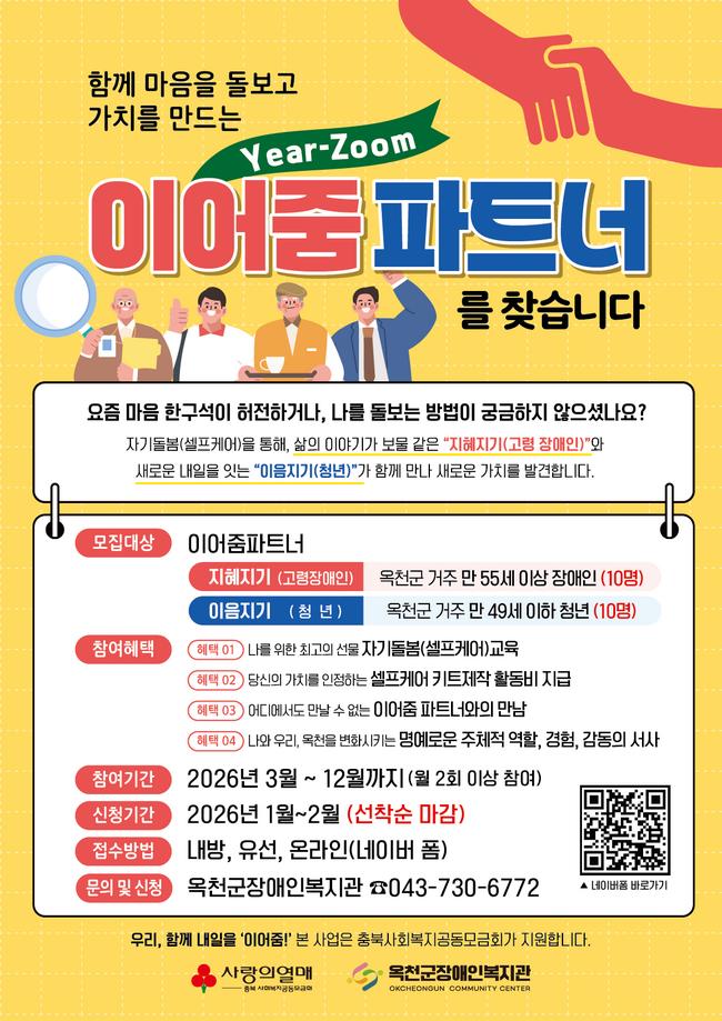 옥천군장애인복지관(관장 황명구)은 충북사회복지공동모금회 지원을 받아 세대통합 자기돌봄 프로젝트 ‘이어줌(year-zoom)’을 본격 추진하며, 프로그램에 함께할 참여자를 모집한다고 밝혔다.