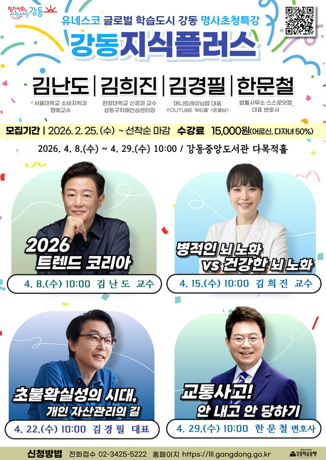 이수희 강동구청장은 “강동구가 ‘유네스코 글로벌 학습도시’로 선정된 만큼, 구민 누구나 일상 속에서 배움의 기회를 누릴 수 있도록 평생학습 기반을 더욱 탄탄히 다져가겠다”며 “이번 명사초청특강이 변화하는 시대를 읽고 삶의 방향을 설계하는 데 실질적인 도움이 되길 바란다”고 말했다.