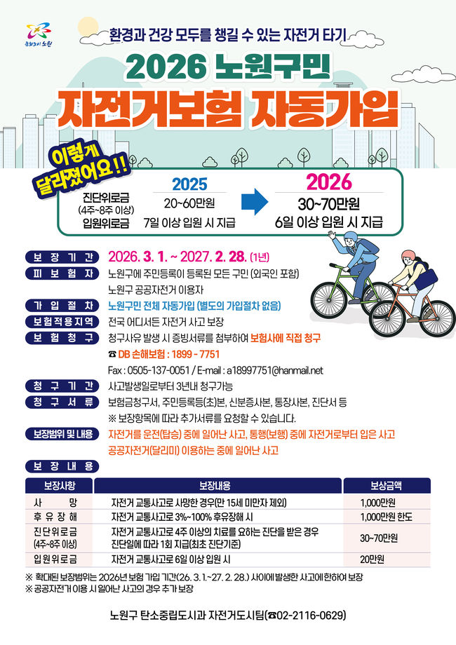가입 대상은 노원구에 주민등록이 된 주민과 등록외국인, 노원구 공공자전거 이용자다. 사고 발생 지역은 전국이다. 보장 기간은 2026년 3월 1일부터 2027년 2월 28일까지 1년이다. 별도 가입 절차 없이 자동 가입되며 타 자치구로 전출하면 자동 해지된다.