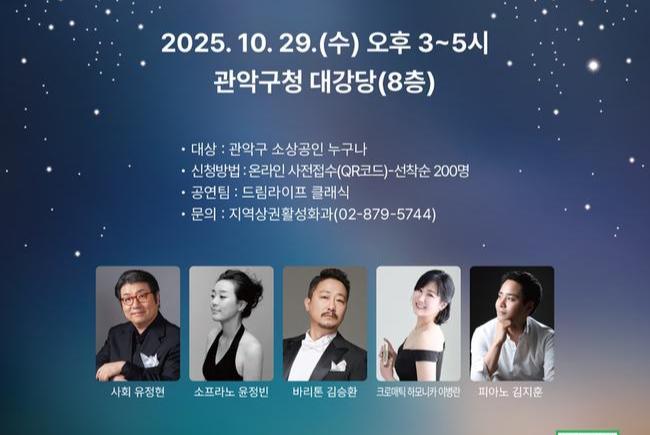 이번 콘서트는 `제4기 관악구 상인대학` 교육과정의 일환으로, 상인대학 수강생을 비롯해 지속되는 경기침체로 인해 위축된 관내 소상공인들을 위로하고자 구가 마련했다.