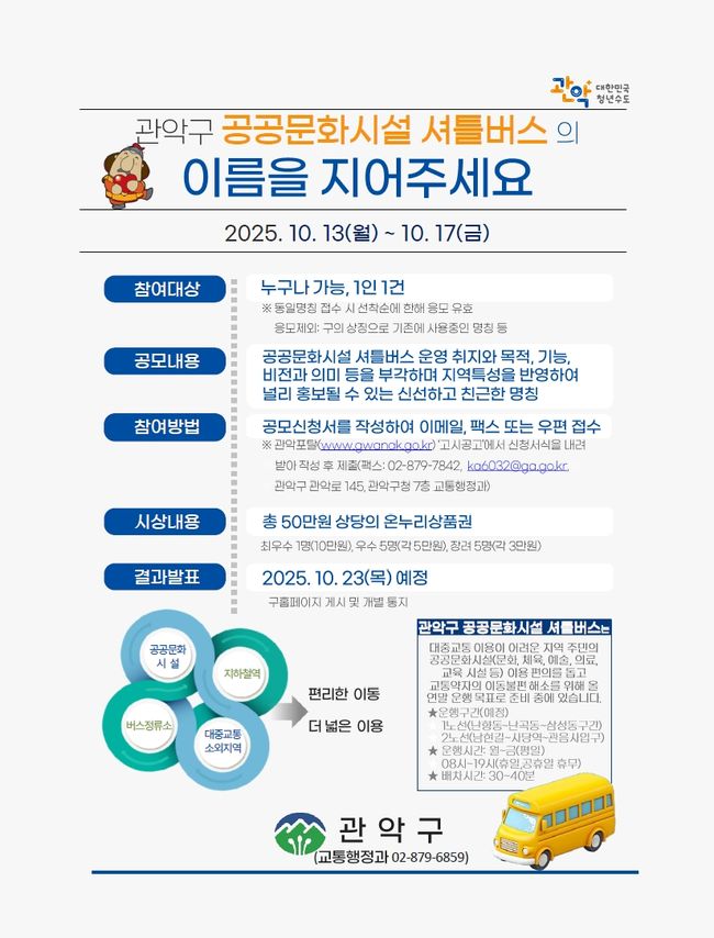 관악구 공공문화시설 셔틀버스 명칭 공모전 홍보 포스터.