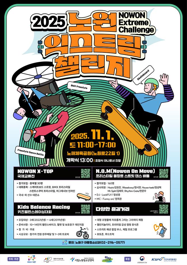 오승록 노원구청장은 “젊음과 도전이 공존하는 이번 행사를 통해 노원이 새로운 감각의 문화도시로 자리 잡길 바란다”며 “익스트림 스포츠를 비롯한 다양한 거리 문화가 일상 속에서 뿌리내릴 수 있도록 지원하겠다”고 말했다.