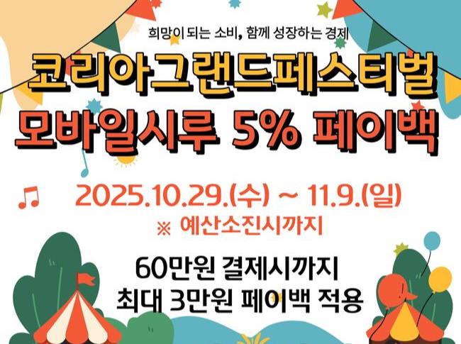 시흥시(시장 임병택)는 오는 10월 29일부터 11월 9일까지 12일간 정부가 추진하는 `코리아 그랜드 페스티벌`에 참여해 시흥화폐 `시루` 모바일결제 시 5%를 돌려주는 환급행사인 페이백을 진행한다. 이를 통해 시민들의 소비를 촉진하고 지역경제에 활력을 불어넣을 계획이다.