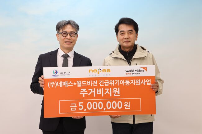 월드비전 충북사업본부(본부장 조성준)는 22일 보은군청을 방문해 지역 내 위기아동 가구를 돕기 위한 주거비 300만 원과 후원기업 ㈜네패스의 필수가전제품 지원금 200만 원 등 총 500만 원을 전달했다.