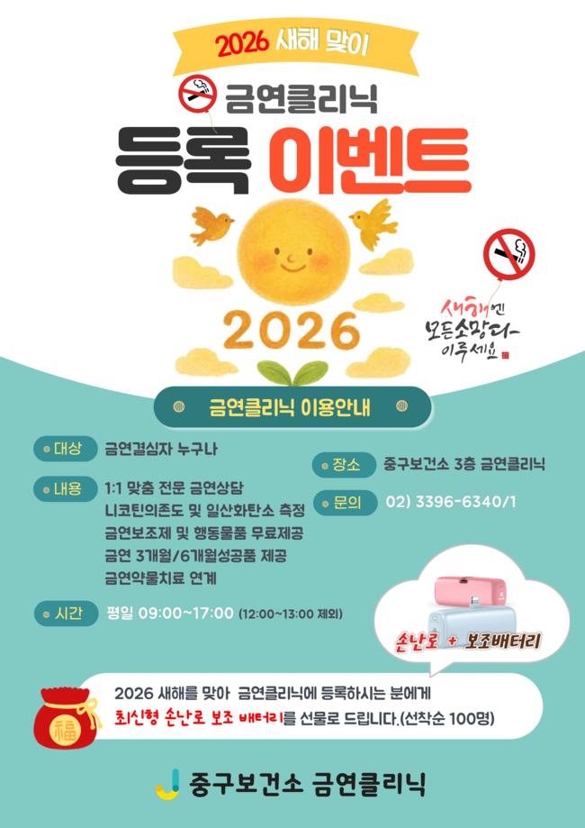 중구 새해맞이 `금연클리닉 등록 이벤트` 홍보 포스터.12일 서울 중구는 지난해 중구보건소 금연클리닉에 참여한 흡연자 가운데 38.4%가 6개월 이상 금연에 성공했다고 밝혔다. 이는 자치구 금연클리닉 평균 성공률 31.1%보다 7.3%포인트 높은 수치로, 중구의 금연 지원 프로그램이 실질적인 성과를 거두고 있다는 평가다.